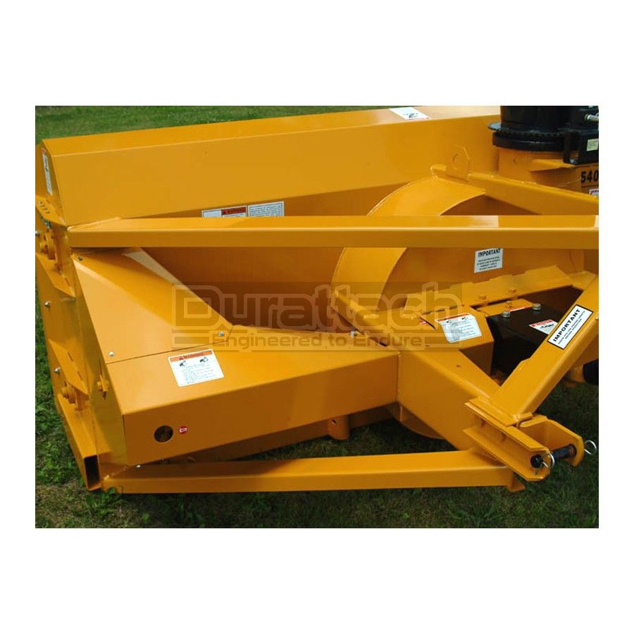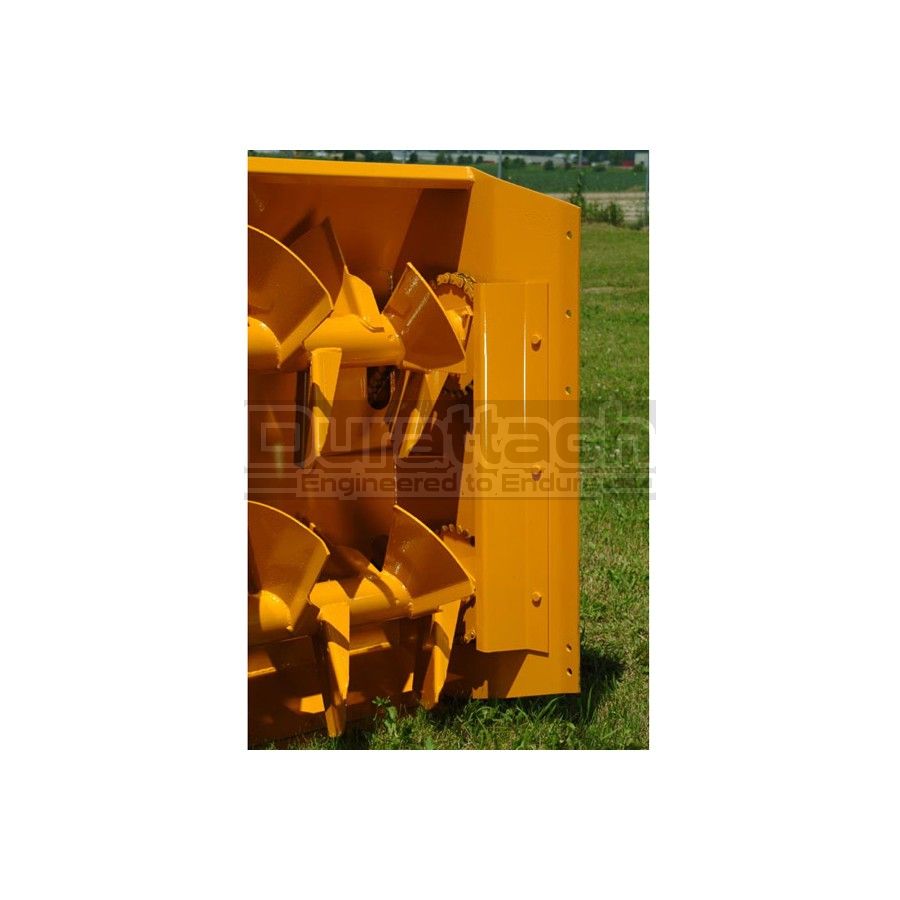 The Lorenz 8000 / 9000 series heavy-duty blowers are designed for tractors up to 150 HP. The 8001 and 9001 run at 540 RPM, and the 8101 and 9101 at 1000 RPM. The end plates are 1/4" thick and housing corners are well braced. The fan is 32" diameter. The dual augers are 20" diameter. The augers are driven with heavy roller chain. The augers are made with paddles that break up the snow for easier feeding into the blower. These paddles are very effective, especially when blowing hard snow or snow that has been moved once already. The augers are protected by an easily-accessible shear assembly near the chain coupler. The drive train is well guarded to protect the operator and the equipment.