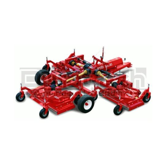 Features: * Heavy duty transport frame. * Cutting heights: from 1” to 5”. * Pull type mower with high flotation transport tires(20.5”x8”x10”). * Single action hydraulic folding wing system for easy transport &storage. * Transport width 8’4” max. * Telescoping wings that allow for adjustable cutting width to increase or decrease mowe overlap. * Constant velocity driveline with slip clutch (1 3/8” ASAE cat. 6). * Stamped steel reinforced wheel arm attached by 8 bolts for maintaining a consistent cutting height. * 3 front antiscalping rollers standard. * Safety chain shield standard. * 8 gauge reinforced mower decks. * Remote safety locks for local transport & deck kick out attachments. * Completely independent free floating mowing decks for a perfect cut on uneven terrain. * Unique double pivot floating linkage. * 12 rubber tires with bearings (4 per deck) to guarantee a perfectly level cut. * Heavy duty, one piece, balanced steel pulleys. * Two heavy duty reinforced belts per deck (SPBX). * Single unit gearboxes with cooling fins. * Spiral gears guarantee strength and quietness. * Stamped steel wheel yokes. * Single unit driveline with shear pin safety. * Assembly Required.