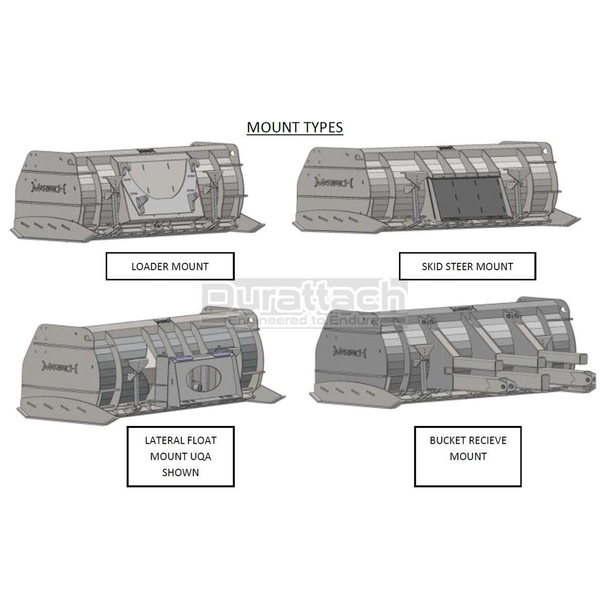 This blade comes standard with a bucket edge mount or loader-specific mount. Please call 208-717-9671 with any questions.