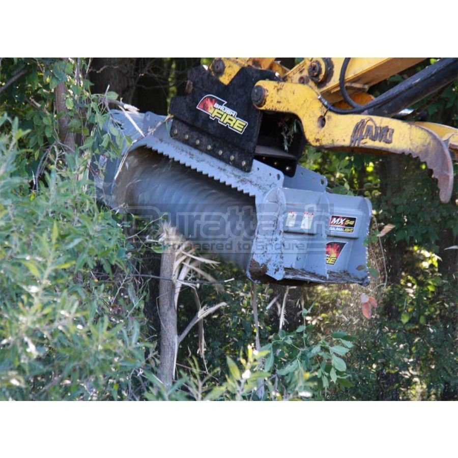 Our 500 series fixed tooth brush mulcher for excavators, designed to maintain and clear fence lines on farms and entry level contractor work. The 500 series Baumalight Brush Fire brush mulchers will efficiently mulch heavy brush and small trees and are offered with two different type of teeth. The Planer style teeth feed their appetite for brush bit by bit, taking small bites and providing the most efficient mulching and cutting. The Ripper style teeth have more of a shredding mulching action. Their v-shaped design makes them less susceptible to impacts with hard objects like stones, making them the better choice when mulching below grade and in fence lines. See our brush cutting size chart to see what limb size this excavator mounted forestry mulcher can handle. With the build in control and precision of the excavator, mulching around objects is not a problem, whether it’s in a ditch or overhead.
