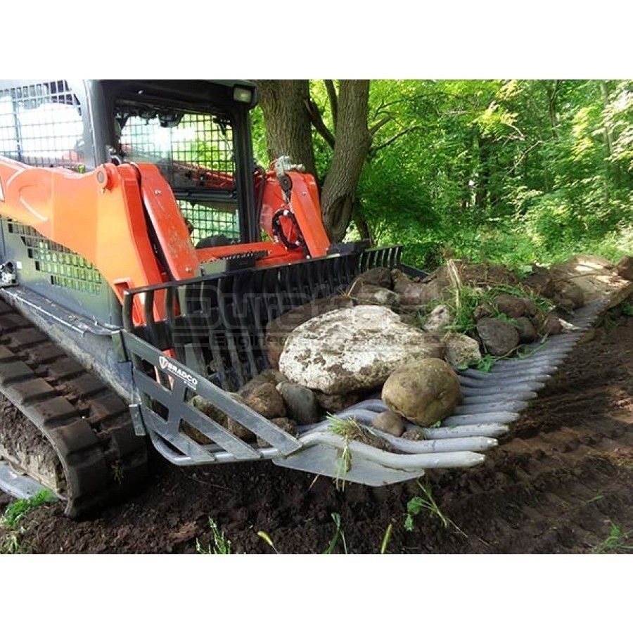 Designed to collect rocks and debris, allowing soil to sift through. Rake design allows for fast clean-up, ground leveling and gathering materials away from buildings and obstructions. Leave the dirt and pay less at the land fill! Exclusive Bradco engineered alloy allows for higher strength and impact resistance.