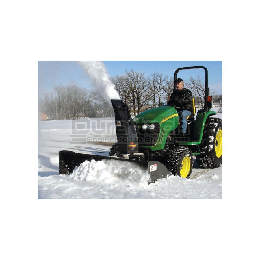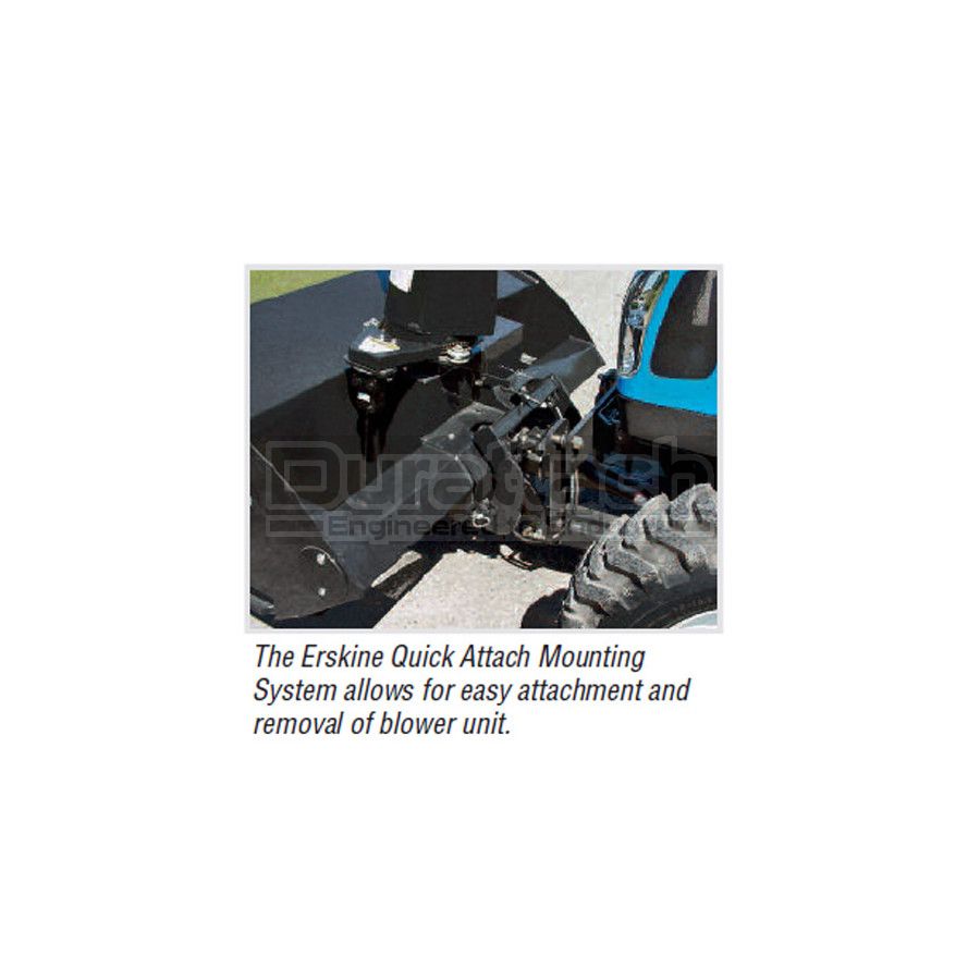 This unit is a true quick attach system--once the initial installation has been done, removal or reattachment is a simple matter that takes about 5-10 minutes. Standard features include hydraulic lift and chute rotation, bolt-on cutting edge, and adjustable skid shoes. These ruggedly built Erskine snowblowers are second to none in features, performance, and durability.